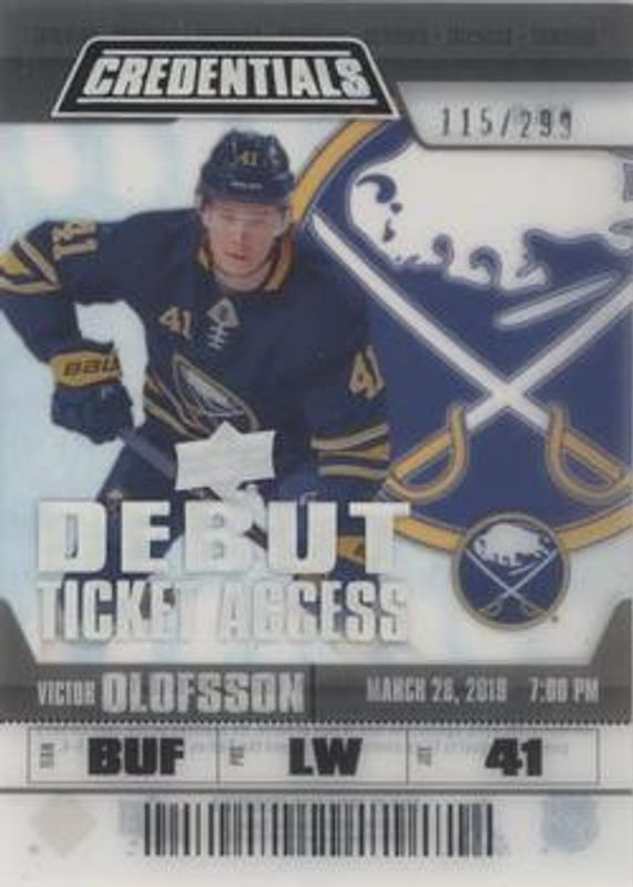 The Victor Olofsson 2019 Upper Deck Credentials #RTA-8 Debut Ticket Access Acetate /299 Rookie card is 1 of 19 Victor Olofsson's card variations in the 2019 Upper Deck Credentials set being tracked by Sports Card Investor, including Base /699, Red /99, Green /25, Purple /10, and Black /1.