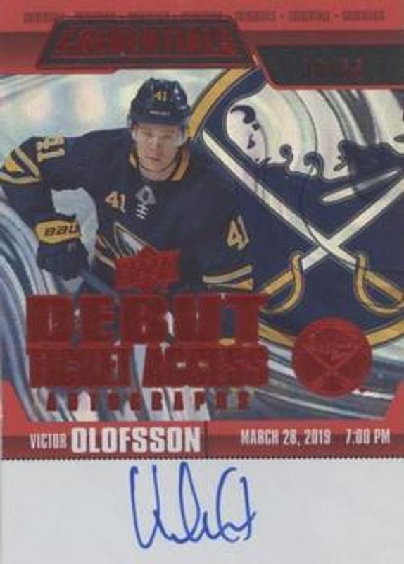 The Victor Olofsson 2019 Upper Deck Credentials #RTAA-VO Debut Ticket Access Autographs Red /65 Rookie card is 1 of 19 Victor Olofsson's card variations in the 2019 Upper Deck Credentials set being tracked by Sports Card Investor, including Base /699, Red /99, Green /25, Purple /10, and Black /1.