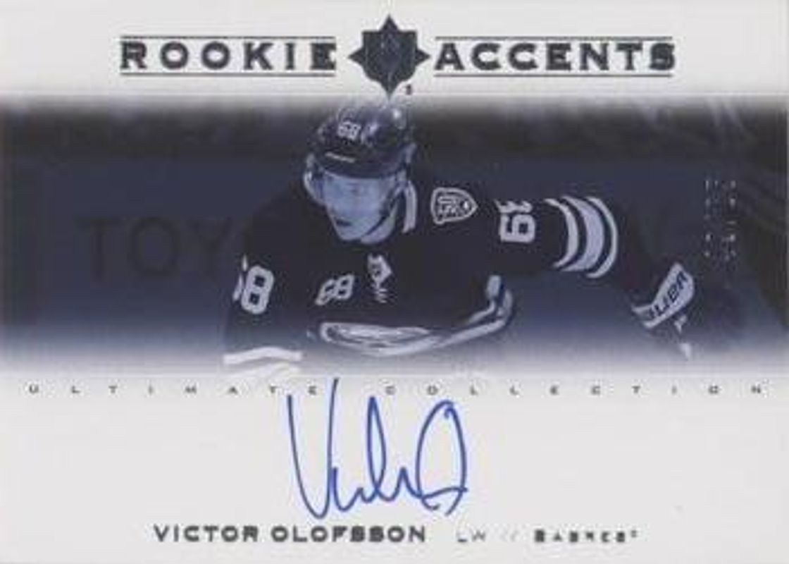 The Victor Olofsson 2020 Upper Deck Ultimate Collection #RA-VO 2019 Upper Deck Ultimate Collection Update: Rookie Accents /65 card is 1 of 25 Victor Olofsson's card variations in the 2020 Upper Deck Ultimate Collection set being tracked by Sports Card Investor, including Base /299, Autographs, Gold /35, Autographs Gold /15, and Jumbo Patch /15.