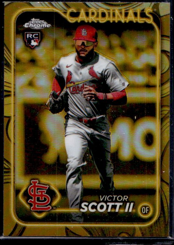 The Victor Scott II 2024 Topps Gilded Collection #115 Base /99 Rookie card is 1 of 7 Victor Scott II's card variations in the 2024 Topps Gilded Collection set being tracked by Sports Card Investor, including Gold Wave Refractor /75, Mini-Diamond Refractor /50, Gold RayWave Refractor /25, Gold Lava Refractor /10, and Electroplate Refractor /5.