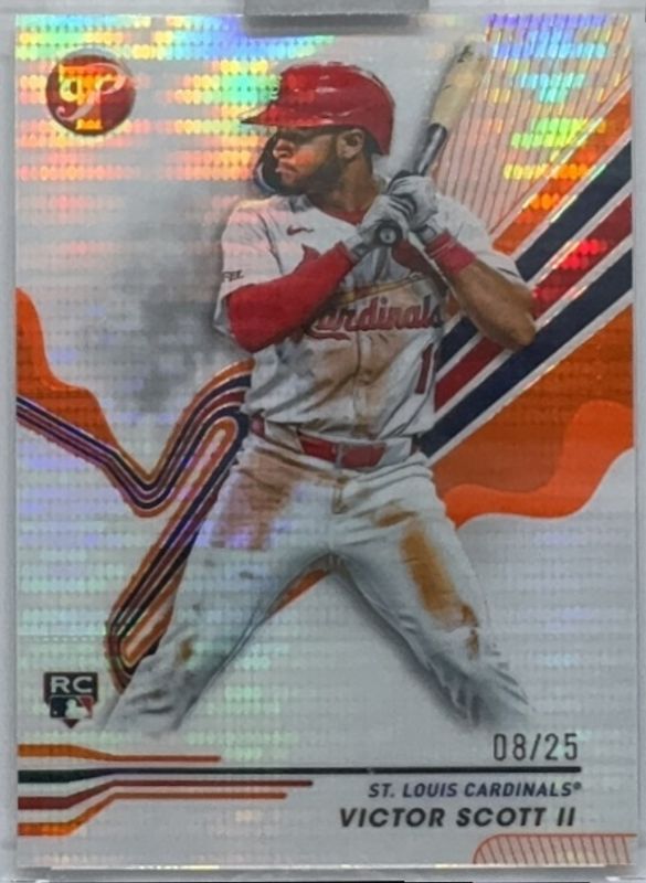 The Victor Scott II 2024 Topps Pristine #93 Pristine Orange Refractor /25 Rookie card is 1 of 18 Victor Scott II's card variations in the 2024 Topps Pristine set being tracked by Sports Card Investor, including Base, Pristine Refractor, Refractor, Green Refractor /150, and Pristine Purple Refractor /99.