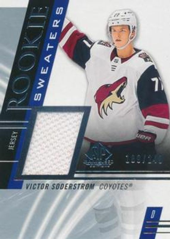 The Victor Soderstrom 2020 SP Game Used #RS-VS Rookie Sweaters /249 card is 1 of 18 Victor Soderstrom's card variations in the 2020 SP Game Used set being tracked by Sports Card Investor, including Base /31, Golden Burst /235, Blue Burst /135, Purple Burst /5, and Green Burst /1.