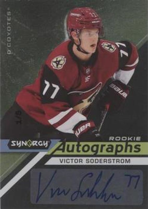 The Victor Soderstrom 2020 Upper Deck Synergy #AR-VS Autographs Rookies Black /15 card is 1 of 14 Victor Soderstrom's card variations in the 2020 Upper Deck Synergy set being tracked by Sports Card Investor, including Base /21, Red, Red Bounty, Purple /35, and Autographs Rookies.