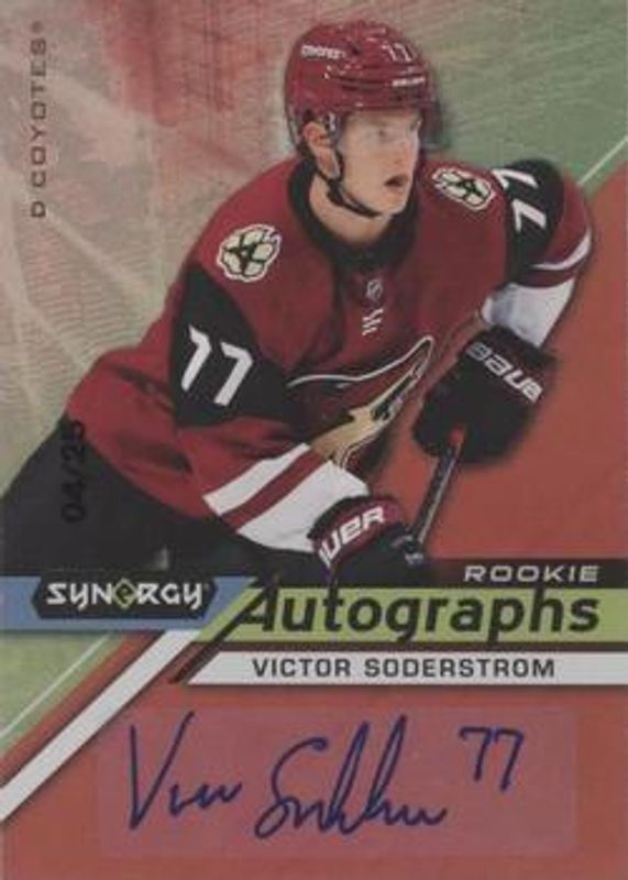 The Victor Soderstrom 2020 Upper Deck Synergy #AR-VS Autographs Rookies Red /49 card is 1 of 14 Victor Soderstrom's card variations in the 2020 Upper Deck Synergy set being tracked by Sports Card Investor, including Base /21, Red, Red Bounty, Purple /35, and Autographs Rookies.