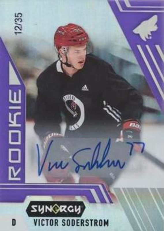 The Victor Soderstrom 2020 Upper Deck Synergy #119 Purple /35 Rookie card is 1 of 14 Victor Soderstrom's card variations in the 2020 Upper Deck Synergy set being tracked by Sports Card Investor, including Base /21, Red, Red Bounty, Autographs Rookies, and Exceptional Futures /749.