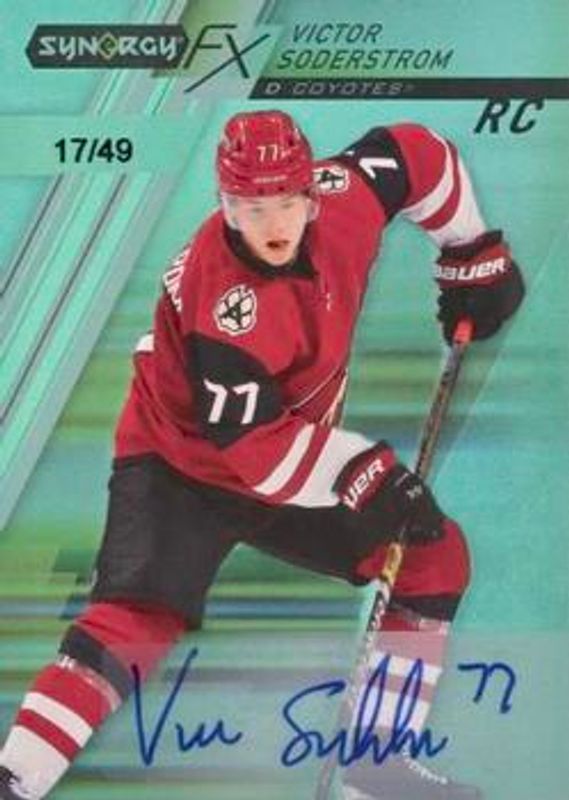 The Victor Soderstrom 2020 Upper Deck Synergy #FXR-VS Synergy FX Rookies Green /99 card is 1 of 14 Victor Soderstrom's card variations in the 2020 Upper Deck Synergy set being tracked by Sports Card Investor, including Base /21, Red, Red Bounty, Purple /35, and Autographs Rookies.