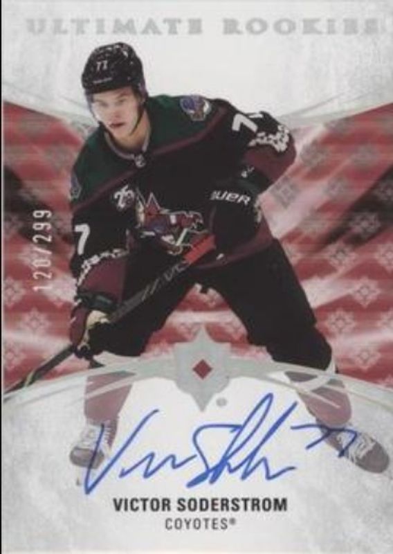 The Victor Soderstrom 2021 Upper Deck Ultimate Collection #141 2020 Upper Deck Ultimate Collection Update /299 card is 1 of 11 Victor Soderstrom's card variations in the 2021 Upper Deck Ultimate Collection set being tracked by Sports Card Investor, including 2020 Upper Deck Ultimate Collection Update: Ultimate Introductions Autographs, 2020 Upper Deck Ultimate Collection Update: Ultimate Signatures Rookies, 2020 Upper Deck Ultimate Collection Update: Debut Threads /99, 2020 Upper Deck Ultimate Collection Update: Rookie Accents /99, and 2020 Upper Deck Ultimate Collection Update: Ultimate Rookies Autographed - Patch /99.