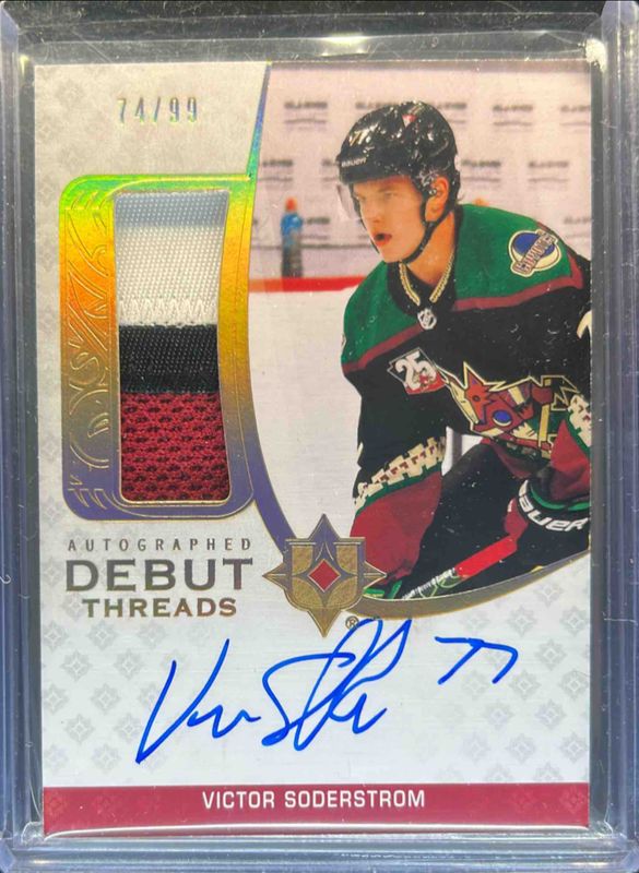 The Victor Soderstrom 2021 Upper Deck Ultimate Collection #ADT-VS 2020 Upper Deck Ultimate Collection Update: Debut Threads /99 card is 1 of 11 Victor Soderstrom's card variations in the 2021 Upper Deck Ultimate Collection set being tracked by Sports Card Investor, including 2020 Upper Deck Ultimate Collection Update: Ultimate Introductions Autographs, 2020 Upper Deck Ultimate Collection Update: Ultimate Signatures Rookies, 2020 Upper Deck Ultimate Collection Update /299, 2020 Upper Deck Ultimate Collection Update: Rookie Accents /99, and 2020 Upper Deck Ultimate Collection Update: Ultimate Rookies Autographed - Patch /99.