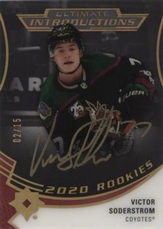 The Victor Soderstrom 2021 Upper Deck Ultimate Collection #UI-61 2020 Upper Deck Ultimate Collection Update: Ultimate Introductions Autographs - Onyx Black /15 card is 1 of 11 Victor Soderstrom's card variations in the 2021 Upper Deck Ultimate Collection set being tracked by Sports Card Investor, including 2020 Upper Deck Ultimate Collection Update: Ultimate Introductions Autographs, 2020 Upper Deck Ultimate Collection Update: Ultimate Signatures Rookies, 2020 Upper Deck Ultimate Collection Update /299, 2020 Upper Deck Ultimate Collection Update: Debut Threads /99, and 2020 Upper Deck Ultimate Collection Update: Rookie Accents /99.