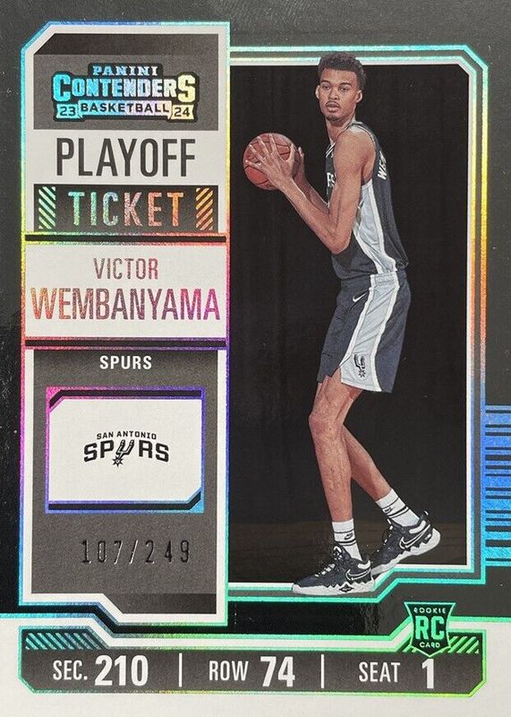 The Victor Wembanyama 2023 Contenders #11 Playoff Ticket /249 Rookie card in Raw condition has moved up $13.00 (+16.9%) in the last 30 days and was last sold for $90.00 .