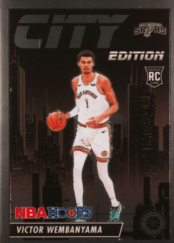 The Victor Wembanyama 2023 Hoops Premium Stock #25 City Edition Rookie card in Raw condition has moved up $11.99 (+400%) in the last 30 days and was last sold for $14.99 .