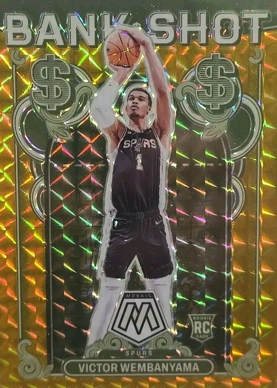 The Victor Wembanyama 2023 Mosaic #17 Bank Shot - Gold /10 Rookie card in Raw condition has not changed in price in the last 30 days and was last sold for $1,111.00 .