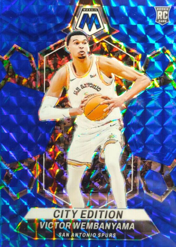 The Victor Wembanyama 2023 Mosaic #282 City Edition - Blue /199 Rookie card in Raw condition has moved up $10.00 (+10.5%) in the last 30 days and was last sold for $105.00 .
