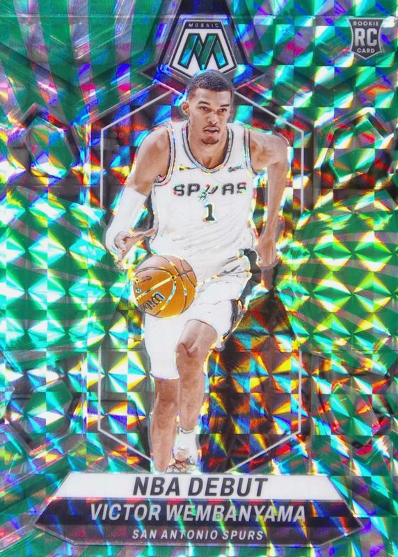 The Victor Wembanyama 2023 Mosaic #257 NBA Debut - Green Swirl /3 Rookie card in Raw condition has not changed in price in the last 30 days and was last sold for $1,180.00 .