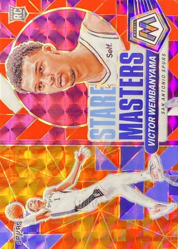 The Victor Wembanyama 2023 Mosaic #16 Stare Masters - Purple /99 Rookie card in Raw condition has not changed in price in the last 30 days and was last sold for $72.76 .