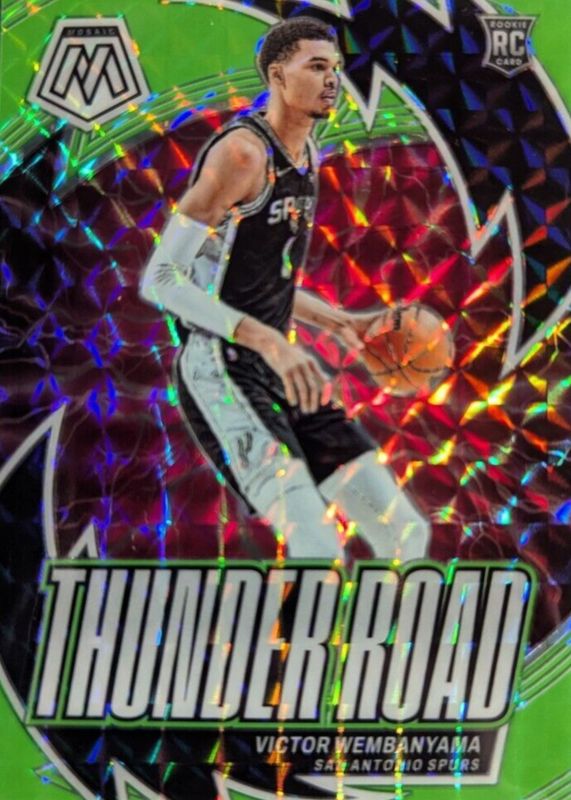 The Victor Wembanyama 2023 Mosaic #8 Thunder Road - Green Fluorescent /10 Rookie card in Raw condition has not changed in price in the last 30 days and was last sold for $399.99 .