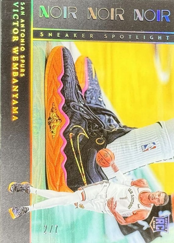 The Victor Wembanyama 2023 Noir #1 Sneaker Spotlight - Holo Gold FOTL /7 Rookie card in Raw condition has not changed in price in the last 30 days and was last sold for $3,677.00 .