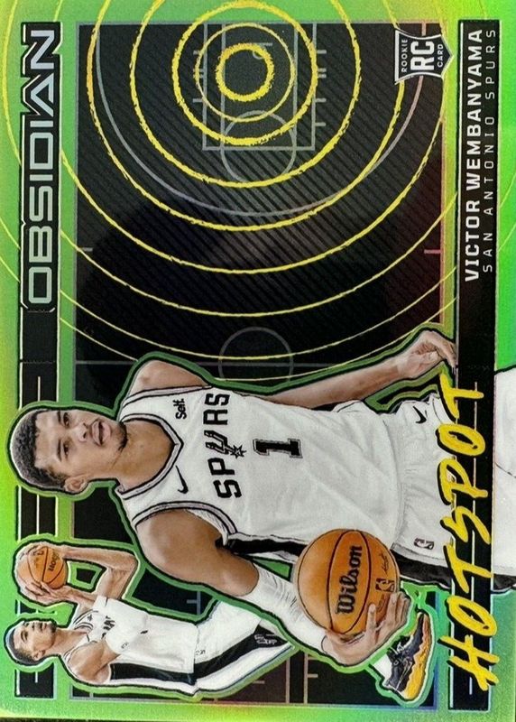 The Victor Wembanyama 2023 Obsidian #18 Hotspot - Electric Etch Green Flood /25 Rookie card in Raw condition has not changed in price in the last 30 days and was last sold for $248.50 .