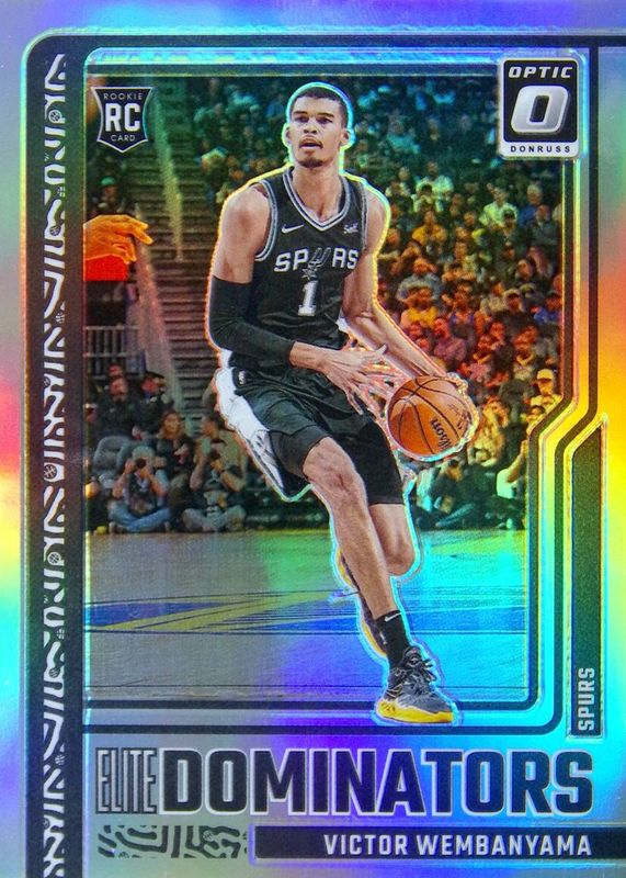 The Victor Wembanyama 2023 Optic #18 Elite Dominators - Holo Rookie card in Raw condition has moved up $13.99 (+133%) in the last 30 days and was last sold for $24.49 .