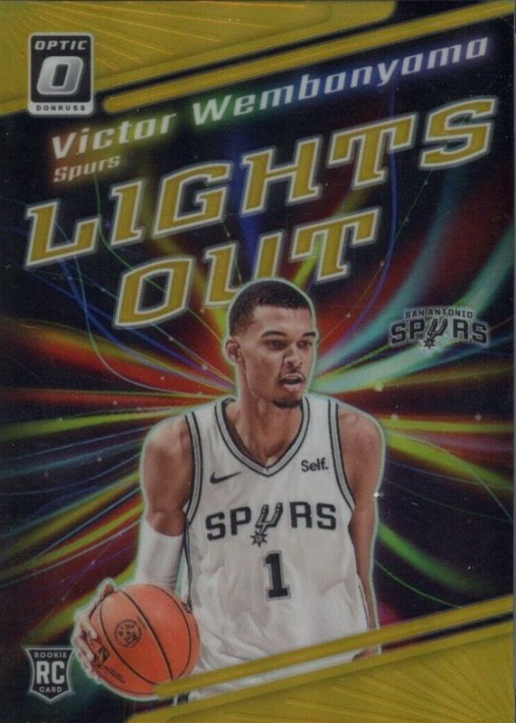 The Victor Wembanyama 2023 Optic #4 Lights Out - Gold /10 Rookie card in Raw condition has not changed in price in the last 30 days and was last sold for $836.00 .