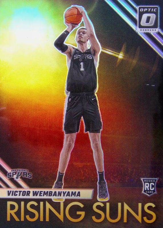 The Victor Wembanyama 2023 Optic #11 Rising Suns - Holo Rookie card in Raw condition has moved up $0.99 (+12.3%) in the last 30 days and was last sold for $9.01 .