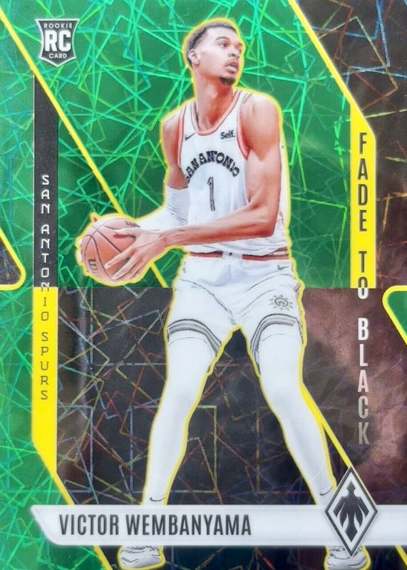 The Victor Wembanyama 2023 Phoenix #11 Fade to Black - Green Lazer /175 Rookie card in Raw condition has moved down -$14.99 (-18.7%) in the last 30 days and was last sold for $65.00 .