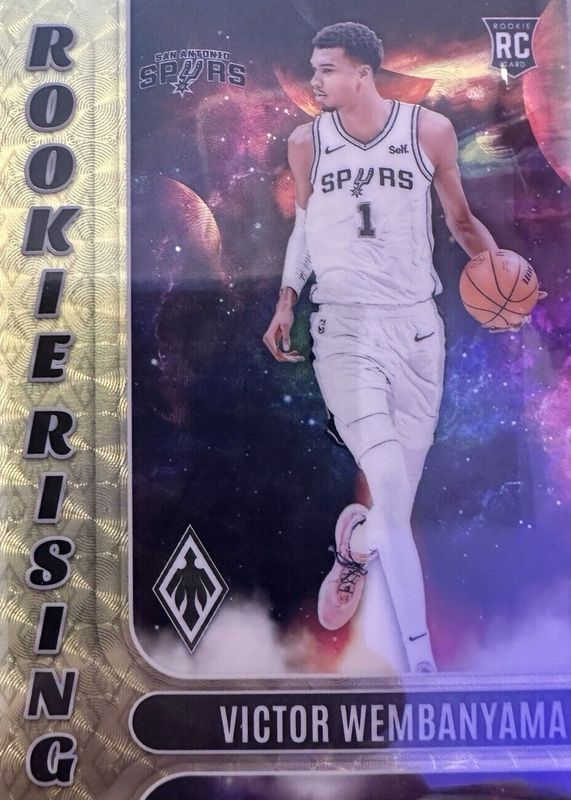 The Victor Wembanyama 2023 Phoenix #13 Rookie Rising - Gold Vinyl /1 card in Raw condition has not changed in price in the last 30 days and was last sold for $4,600.00 .