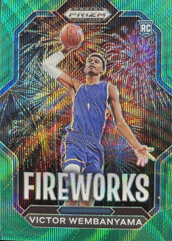 The Victor Wembanyama 2023 Prizm Draft Picks #1 Fireworks - Green Wave Rookie card in Raw condition has not changed in price in the last 30 days and was last sold for $77.00 .