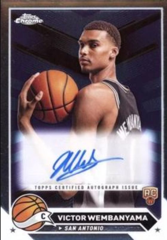 The Victor Wembanyama 2023 Topps Chrome #CG-VW Autographs Rookie card is 1 of 115 Victor Wembanyama's card variations in the 2023 Topps Chrome set being tracked by Sports Card Investor, including Base, Certified Rookie Autographs, Certified Rookie Autographs - Purple Geometric Refractor, Certified Rookie Autographs - Refractor, and Certified Rookie Autographs - Gold Refractor /50.