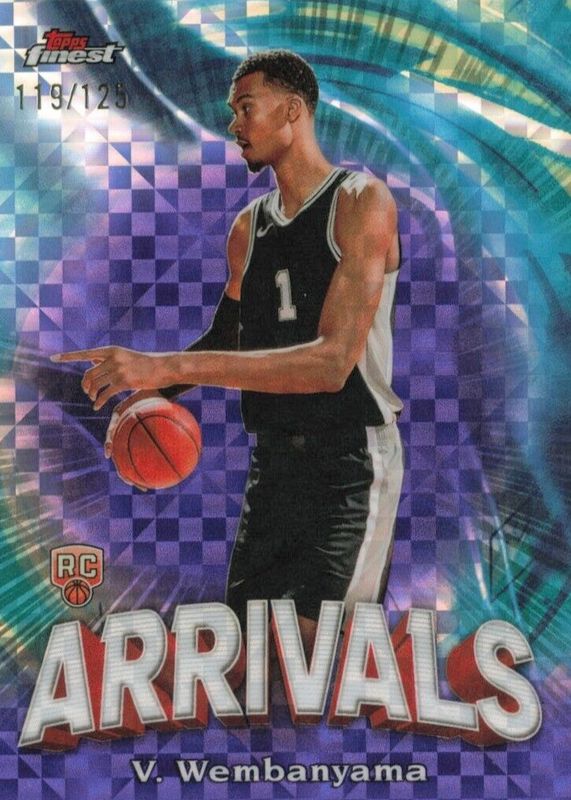 The Victor Wembanyama 2023 Topps Finest #A-6 Arrivals - Purple Checkerboard Refractor /125 Rookie card in Raw condition has not changed in price in the last 30 days and was last sold for $32.88 .