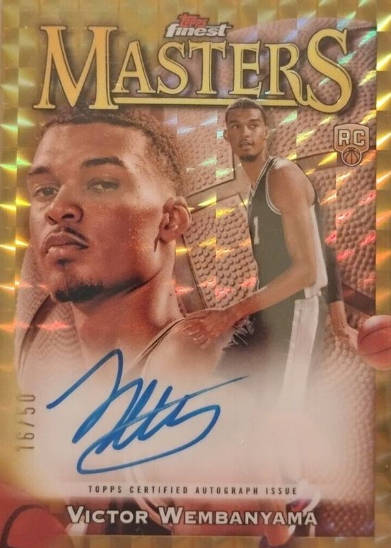 The Victor Wembanyama 2023 Topps Finest #MA-VW Masters Autographs - Gold Geometric Refractor /50 Rookie card in Raw condition has not changed in price in the last 30 days and was last sold for $1,999.99 .