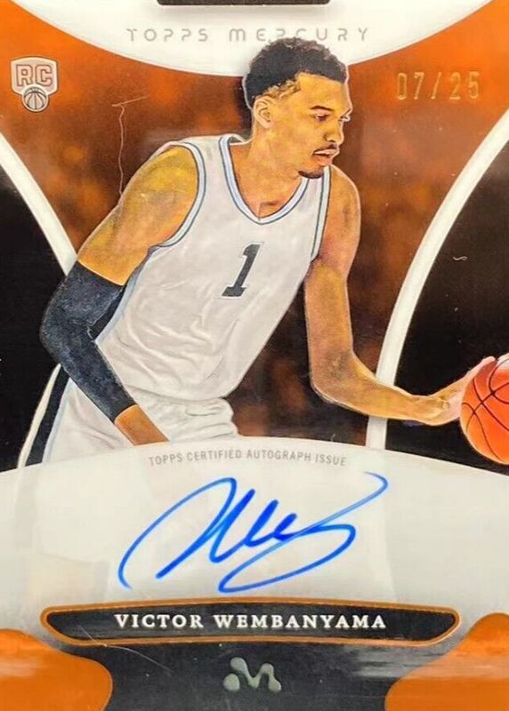 The Victor Wembanyama 2023 Topps Mercury Victor Wembanyama #WA-4 Autographs - Orange Refractor /25 Rookie card in Raw condition has not changed in price in the last 30 days and was last sold for $1,350.00 .