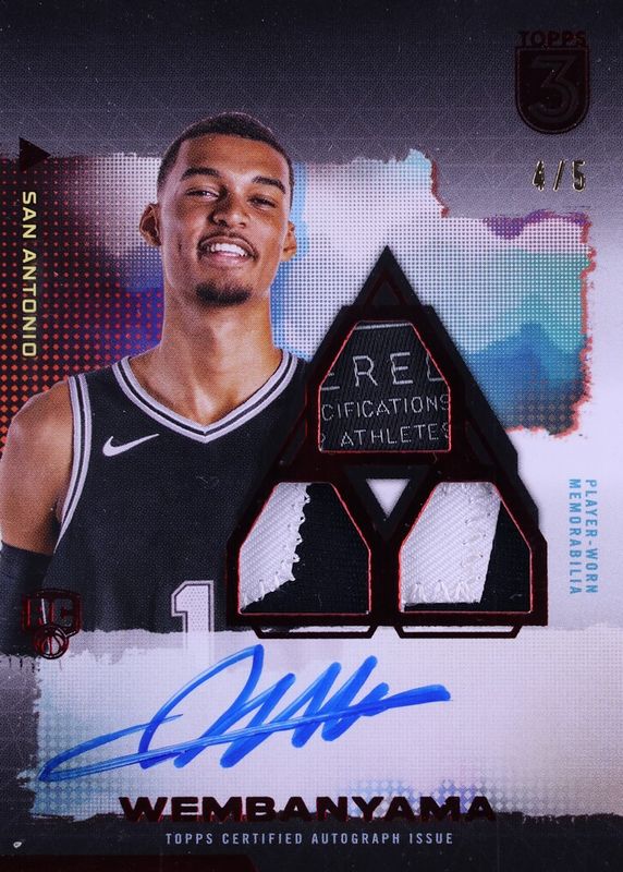 The Victor Wembanyama 2023 Topps Three #101 Rookie 3 Patch Autographs Vertical - Red /5 card in Raw condition has moved down -$1.35K (-36.3%) in the last 30 days and was last sold for $2,370.00 .