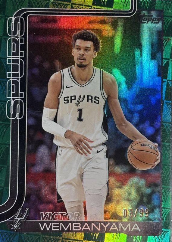 The Victor Wembanyama 2025 Topps #195 Season Tip-Off Green Foilboard /99 card in Raw condition has moved up $49.99 (+167%) in the last 30 days and was last sold for $79.99 .