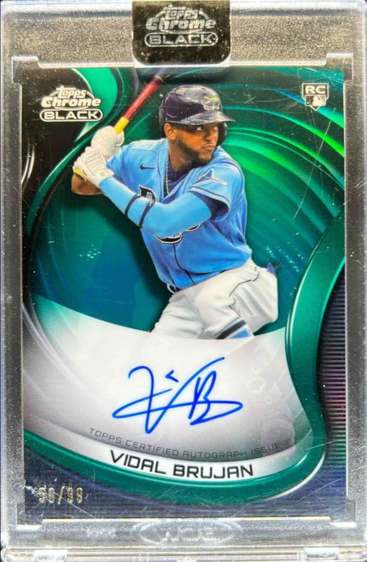 The Vidal Brujan 2022 Topps Chrome Black #CBA-VB Autographs - Green Refractor /99 Rookie card is 1 of 25 Vidal Brujan's card variations in the 2022 Topps Chrome Black set being tracked by Sports Card Investor, including Base, Refractor /199, Purple Mini Diamond Refractor /150, Green Atomic Refractor /99, and Green Refractor /99.