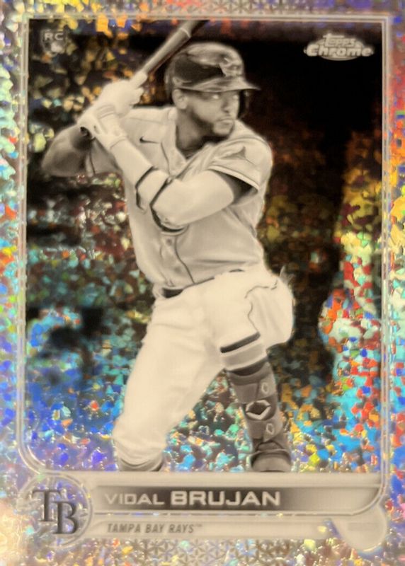 The Vidal Brujan 2022 Topps Chrome #134 Black & White Mini-Diamond Refractor Rookie card in Raw condition has not changed in price in the last 30 days and was last sold for $1.25 .