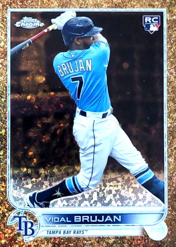 This card is 1 of 10 Vidal Brujan's card variations in the 2022 Topps Gilded Collection set being tracked by Sports Card Investor, including Base /99, RayWave Gold Etch Refractor /25, Lava Gold Etch Refractor /10, Superfractor /1, and Topps Chrome Gold Etch Autographs /99.