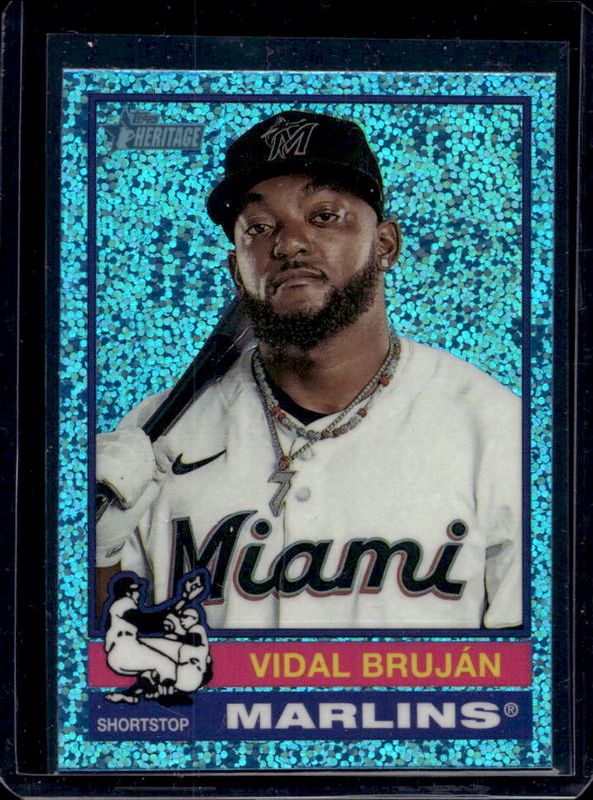 The Vidal Brujan 2025 Topps Heritage #82 Chrome - Aqua Sparkle Refractor card is 1 of 24 Vidal Brujan's card variations in the 2025 Topps Heritage set being tracked by Sports Card Investor, including Base, Black Border, Dark Blue Border, Dark Green Border, and Dark Yellow Border.