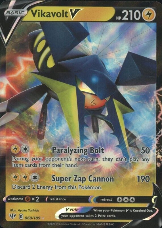 The Vikavolt V 2020 Sword & Shield: Darkness Ablaze #060/189 Holo card in Raw TCG (Near Mint) condition has moved up $1.49 (+59.8%) in the last 30 days and was last sold for $3.98 .