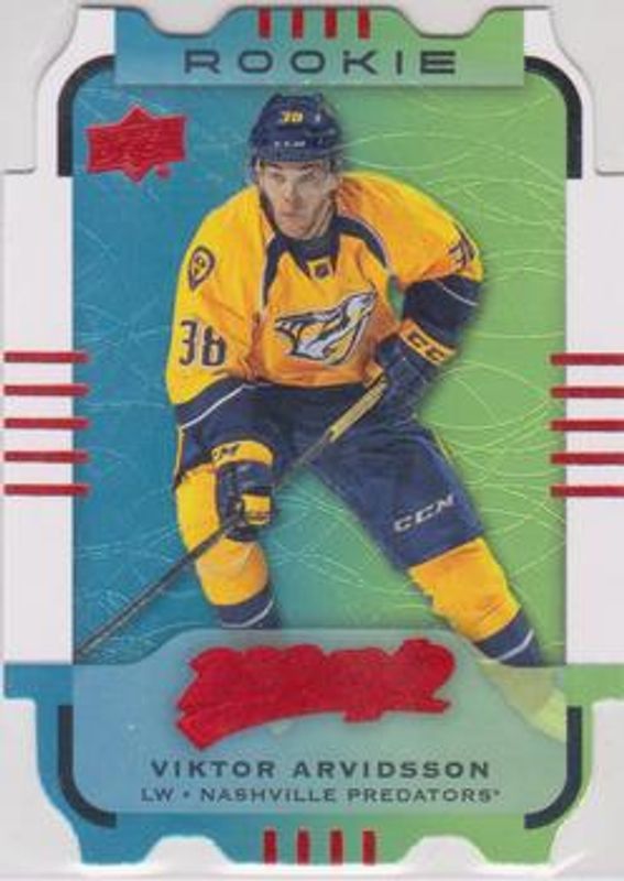The Viktor Arvidsson 2015 Upper Deck MVP #186 Colours & Contours Rookie card is 1 of 10 Viktor Arvidsson's card variations in the 2015 Upper Deck MVP set being tracked by Sports Card Investor, including Base, Green (e Pack), Silver Script, Gold Script /100, and Super Script /25.
