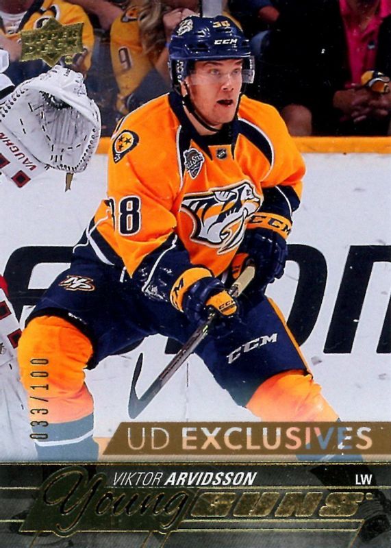The Viktor Arvidsson 2015 Upper Deck #222 Young Guns - UD Exclusives /100 Rookie card in Raw condition has not changed in price in the last 30 days and was last sold for $14.50 .