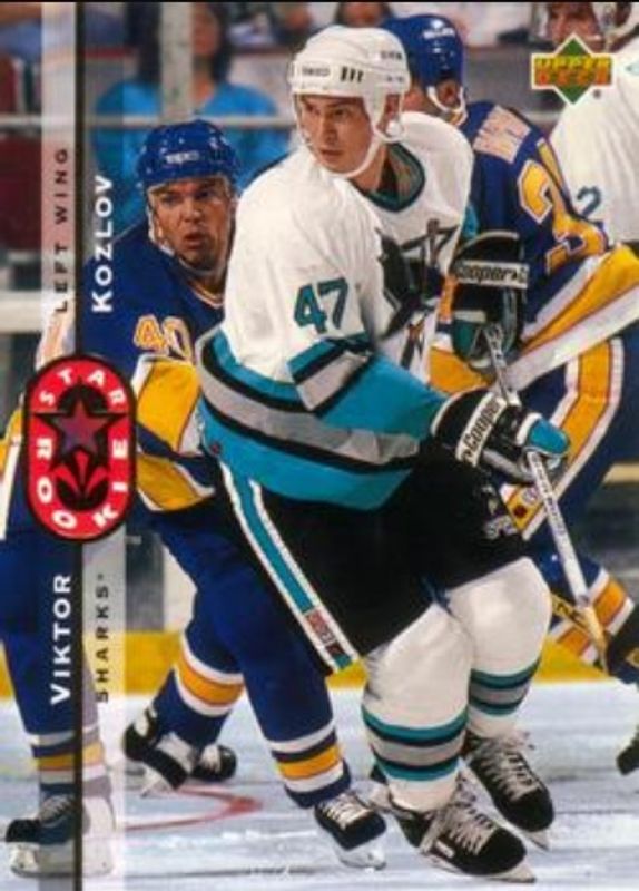 The Viktor Kozlov 1994 Upper Deck #265 Base card is 1 of 7 Viktor Kozlov's card variations in the 1994 Upper Deck set being tracked by Sports Card Investor, including Electric Ice, Predictors Canadian, Predictors Canadian Gold Exchange, Predictors Canadian Silver Exchange, and SP.