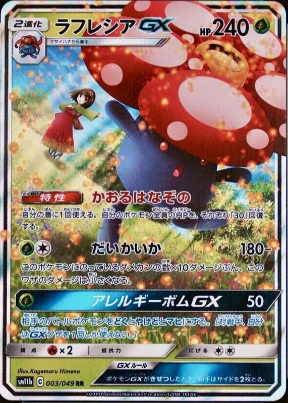 The Vileplume GX 2019 Japanese Sun & Moon: Dream League #003/049 Double Rare card in Raw TCG (Near Mint) condition has moved up $3.98 (+66.1%) in the last 30 days and was last sold for $9.99 .