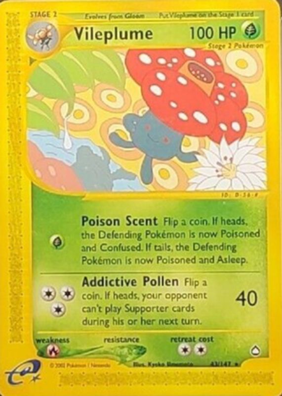 The Vileplume 2003 Aquapolis #043/147 Base card in Raw TCG (Near Mint) condition has not changed in price in the last 30 days and was last sold for $13.65 .