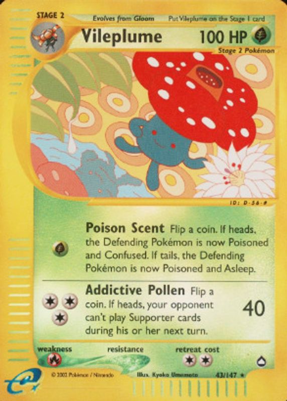 The Vileplume 2003 Aquapolis #043/147 Reverse Holo card in Raw TCG (Near Mint) condition has moved up $0.66 (+1.6%) in the last 30 days and was last sold for $41.96 .