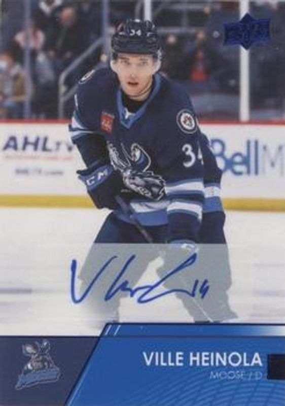 The Ville Heinola 2021 Upper Deck AHL #29 Autographs card is 1 of 9 Ville Heinola's card variations in the 2021 Upper Deck AHL set being tracked by Sports Card Investor, including Base, Exclusives /100, High Gloss /10, Blue, and Printing Plates - Black /1.