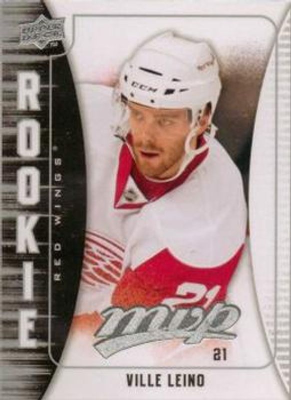 The Ville Leino 2009 Upper Deck MVP #322 Base Rookie card is 1 of 3 Ville Leino's card variations in the 2009 Upper Deck MVP set being tracked by Sports Card Investor, including Gold Script /100, and Super Script /25.