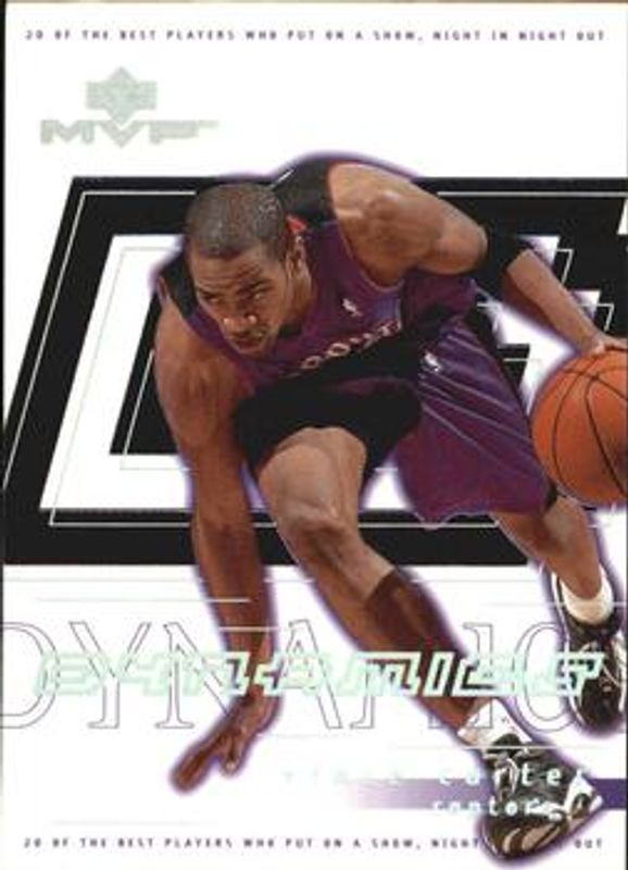 The Vince Carter 2000 Upper Deck MVP #D11 Dynamics card is 1 of 7 Vince Carter's card variations in the 2000 Upper Deck MVP set being tracked by Sports Card Investor, including Base, Silver Script, Gold Script /100, Super Script /25, and MVP Theatre.