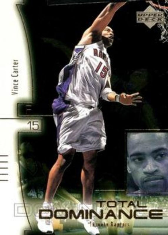 The Vince Carter 2000 Upper Deck #TD7 Total Dominance card is 1 of 10 Vince Carter's card variations in the 2000 Upper Deck set being tracked by Sports Card Investor, including #162 Base, #416 Base, #162 UD Exclusives Silver /100, #416 UD Exclusives Silver /100, and #AS10 All Star Class.