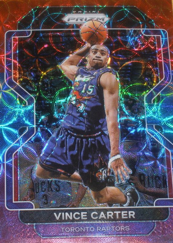 This card is 1 of 39 Vince Carter's card variations in the 2021 Prizm set being tracked by Sports Card Investor, including Red /299, Blue /199, Fast Break Blue /150, Premium Factory Set /150, and Purple Ice /149.